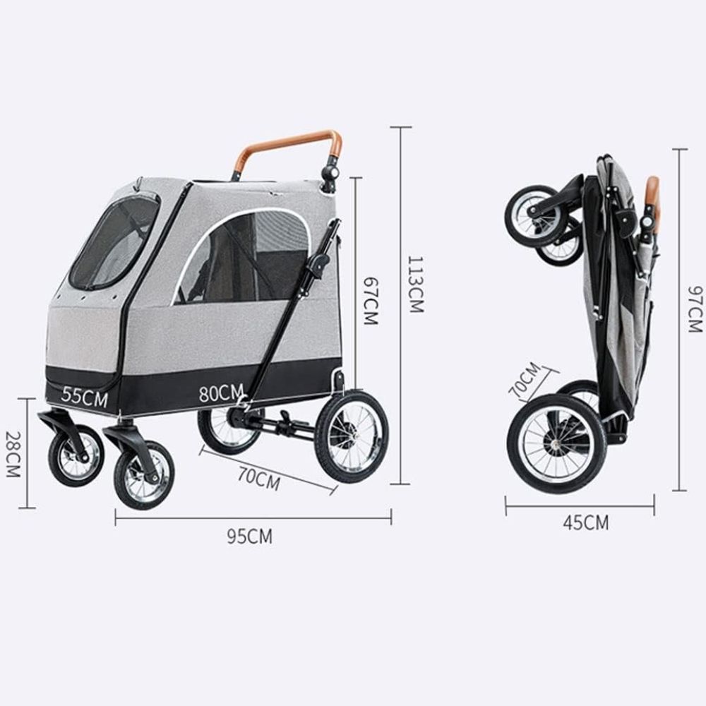 Poussette pour gros chien Topmast grise, capacité 40 kg, grandes roues caoutchouc avec suspension pour confort optimal. Habitacle spacieux, double accès, harnais de sécurité, frein arrière et poignée réglable. Idéale pour balades urbaines, parcs et sorties avec chiens âgés ou fatigués.