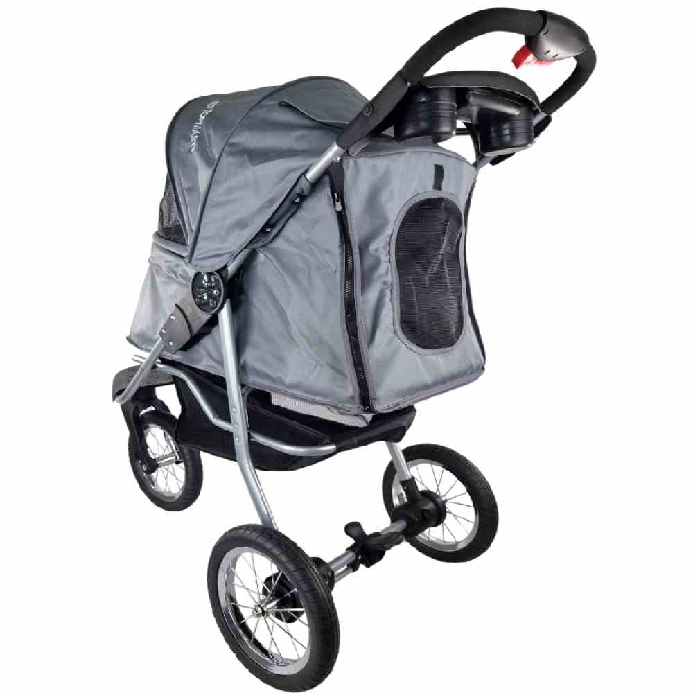 Cette poussette anthracite intègre un frein spécial sur l’essieu arrière pour contrôler les descentes en toute sécurité. Le harnais de sécurité maintient votre chien en place. Vous profitez du porte-gobelet et du grand panier de rangement sous la poussette pour transporter vos affaires. Pliage/dépliage simple avec poignée robuste.
